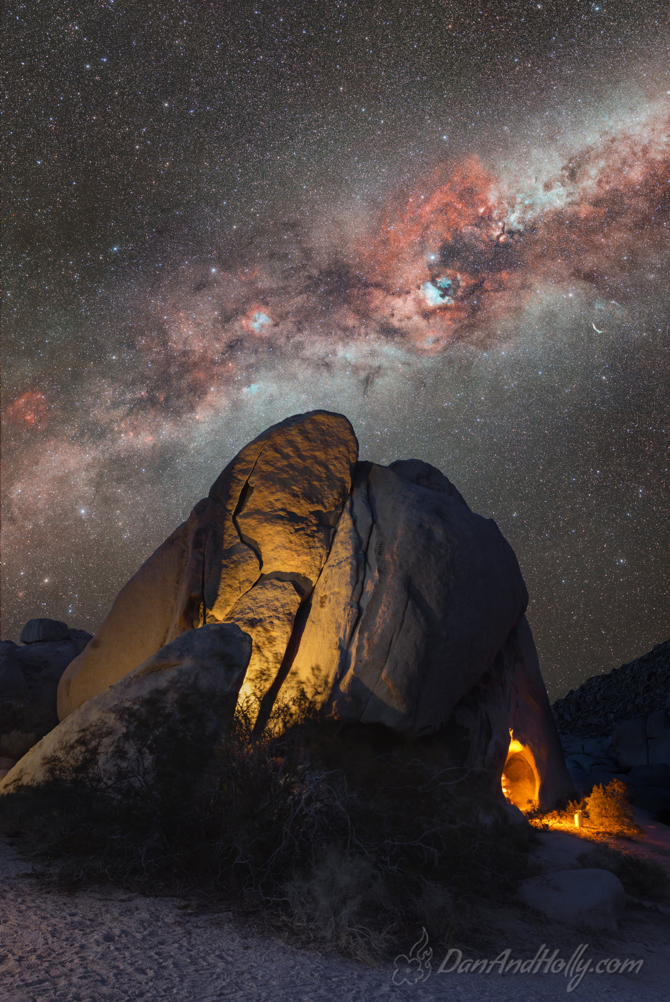When my buddy Mark and I pulled up to the parking area at Paac Kü̱vü̱hü̱’k, this big rock really stood out to me. I walked around it and tried to work out how I would photograph it at night, and how I might want to light it up. I had spotted the little cave on the right side and had wondered what it might look like to put a light in there – if I could get it bright enough to be interesting. Well, it turns out I didn’t have to wonder for very long. As we were exploring around the area a family showed up – complete with some sort of propane fire pit thing – and proceeded to take up residence inside the cave, and it was BRIGHT! Fortunately it was a bit cold for them, even with the firepit, and they bailed soon after dark, allowing us to better control the lighting of everything else. I’m not sure how legal that all was, but it definitely made for an interesting image!