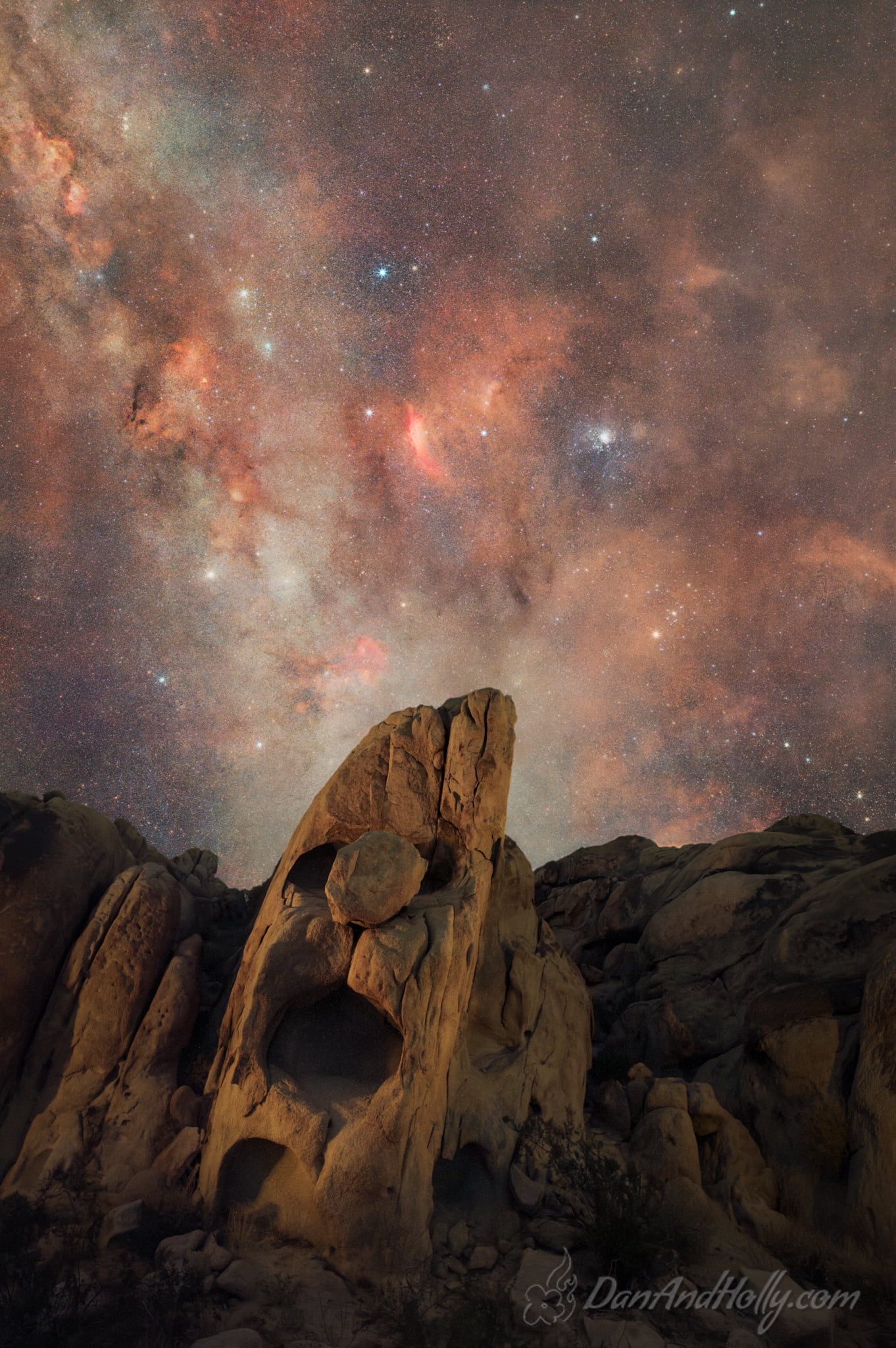 Almost always when I approach a shoot like this, I have some idea of what will line up with the foreground in the sky. For this scene, however, Mark couldn’t exactly remember which way he was facing when he took the scouting picture, and satellite imagery isn’t terribly helpful in this case. So in this case I got to show up and just be surprised by it all. As luck would have it, the California nebula and Pleiades, along with the massive dust cloud that surrounds them, rise just above it, and that suited me just fine! The dust explosion look worked well with the mischievous-looking Grinch face in the rock I thought.
